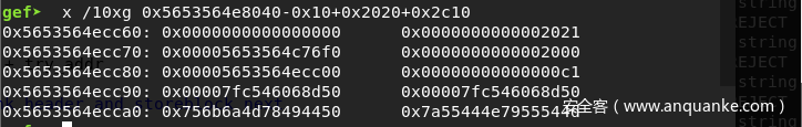 从0x2c10被溢出为0x2cf1,下一个chunk应该从0x5656564ea050 + 0x2cf0 = 0x5656564ecd40开始,现在这里并没有chunk信息,下一步需要在这里伪造chunk信息。