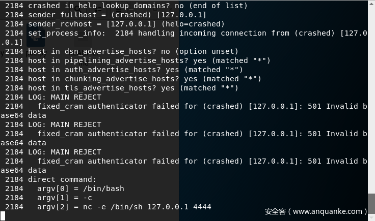 这里需要提一下就是,command命令长度是有限制的,否则会覆盖后面的日志文件路径字符串,导致exim进入其他错误处理流程而不调用execv函数执行command命令。