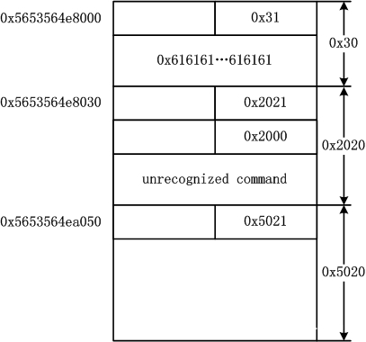 如上图所示,之前ehlo(s, "a"*0x20)占用的0x30字节内存并未释放,只空出0x2020字节空间。此时的堆布局如下图所示。