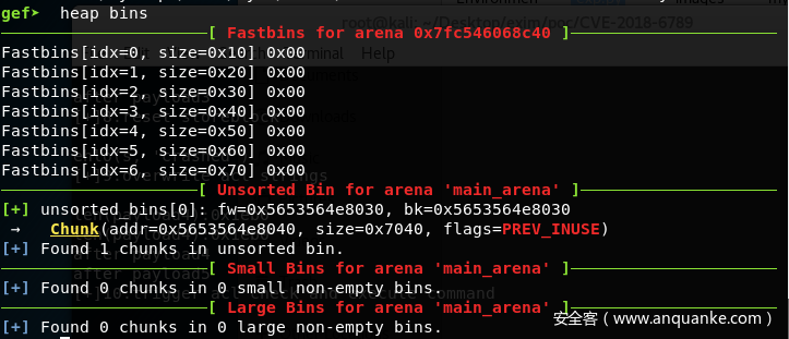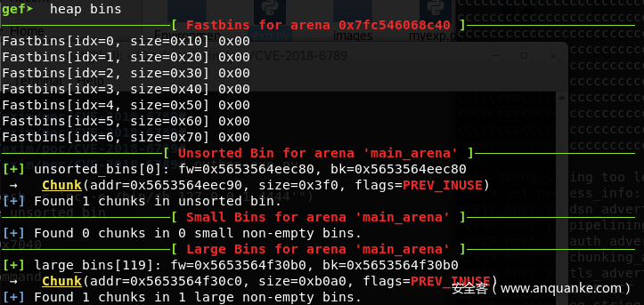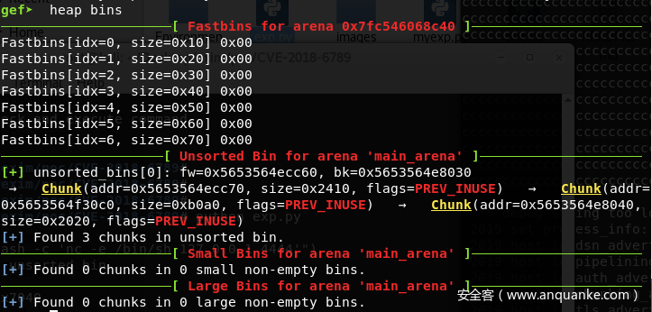 此时,unsorted bin中有两个大小为0x2020的chunk(0x5653564e8040、0x5653564ecc70),下一步就是先占用这两个0x2020字节大小的unsorted bin,然后覆盖0x5653564c76f0这个chunk。