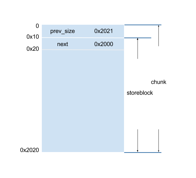 exim在libc提供的堆管理机制的基础上实现了一套自己的管理堆块的方法,引入了storepool、storeblock的概念。store pool是一个单链表结构,每一个节点都是一个storeblock,每个store block的数据大小至少为0x2000。storeblock的结构包含在chunk中,在chunk的基础上多包含一个指向下一个storeblock的next指针和当前storeblock的大小,如下图所示。