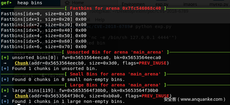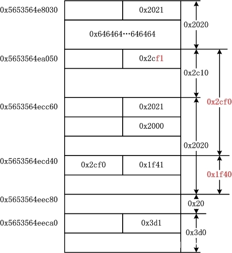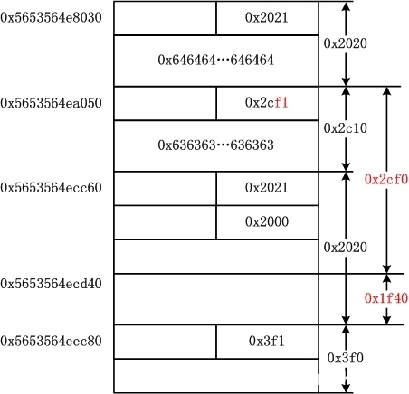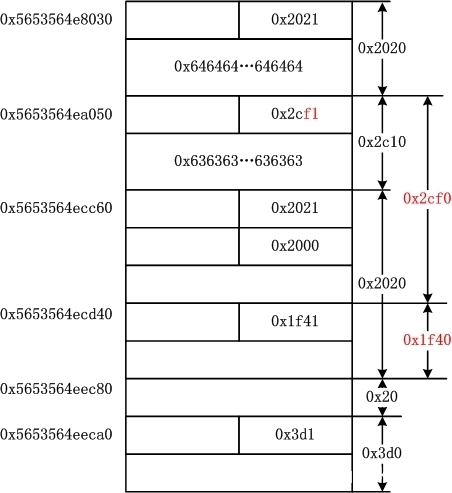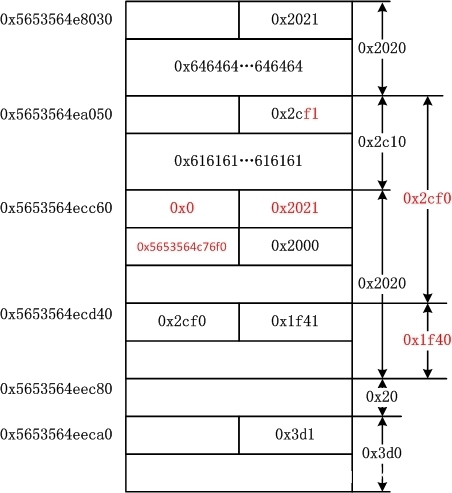 占用第一个0x2020字节大小的chunk:0x5653564e8040。解释一下,这里也是用伪造chunk的方法,首先伪造一个0xb0大小的chunk,然后伪造一个0x1f40大小的chunk,这样来达到占用0x2020大小chunk的目的。