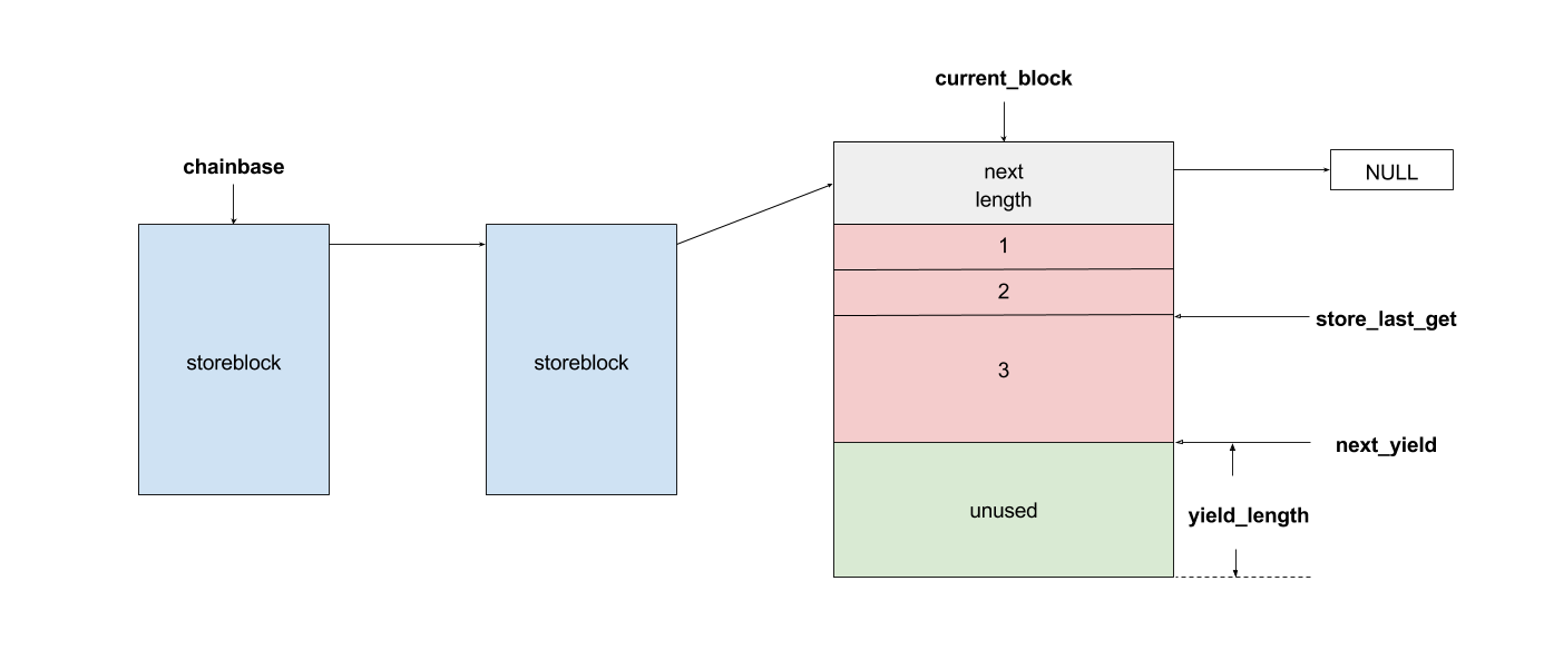 下图展示了一个storepool的完整的数据存储方式,chainbase是头结点,指向第一个storeblock,current_block是尾节点,指向链表中的最后一个节点。store_last_get指向current_block中最后分配的空间,next_yield指向下一次要分配空间时的起始位置,yield_length则表示当前store_block中剩余的可分配字节数。当current_block中的剩余字节数(yield_length)小于请求分配的字节数时,会调用malloc分配一个新的storeblock块,然后从该storeblock中分配需要的空间。