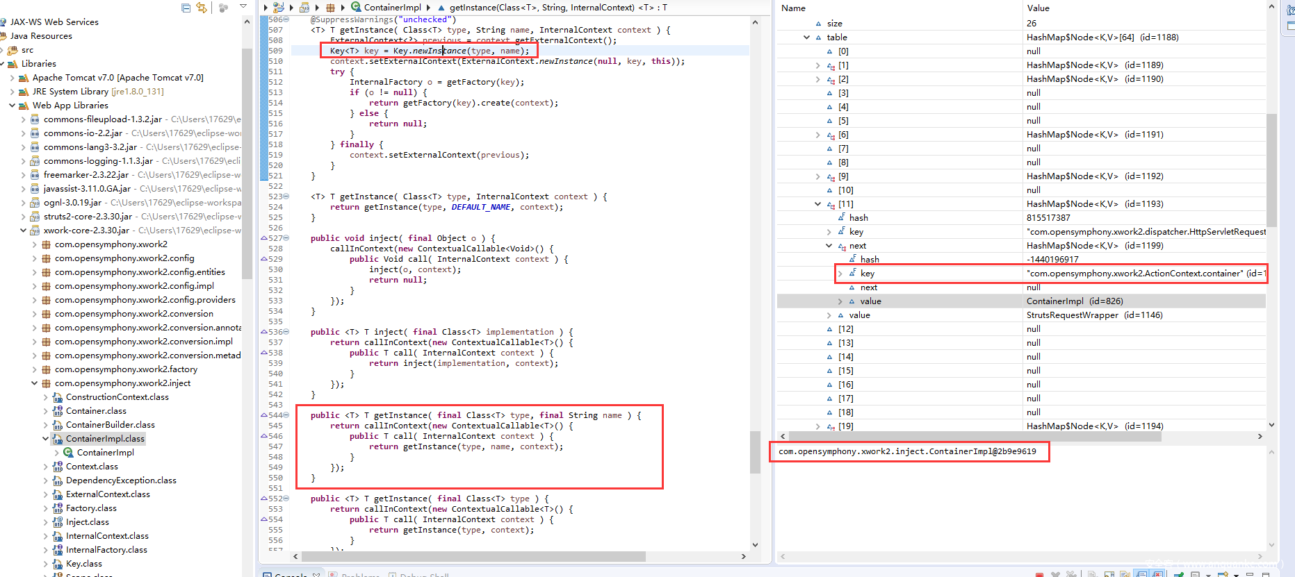 为了获取到OgnlUtil对象,使用了com.opensymphony.xwork2.inject.ContainerImpl.getInstance进行实例化。