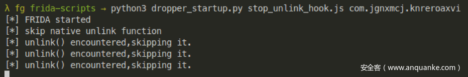 这样操作后,一旦调用unlink()函数,FRIDA就会拦截调用,运行我们的代码。在这个例子中,此时会简单地输出一条日志信息,通知我们该调用已被跳过。