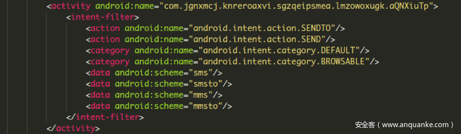 我们首先注意到一件事,应用的所有组件名称都使用了完全随机的字符串。这可能是恶意行为的一种特征,但合法应用开发者可能也会使用这种技巧来避免竞争对手逆向分析自己的劳动成果。