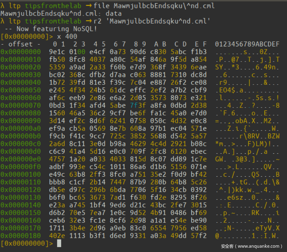 可以先使用bash中的file命令来分析这个文件。不幸的是,该命令无法检测到该文件的具体类型。使用十六进制编辑器(这里我们使用的是radare2,这是一款开源逆向工程框架)查看文件后,我们仍然无法确定文件的具体类型。