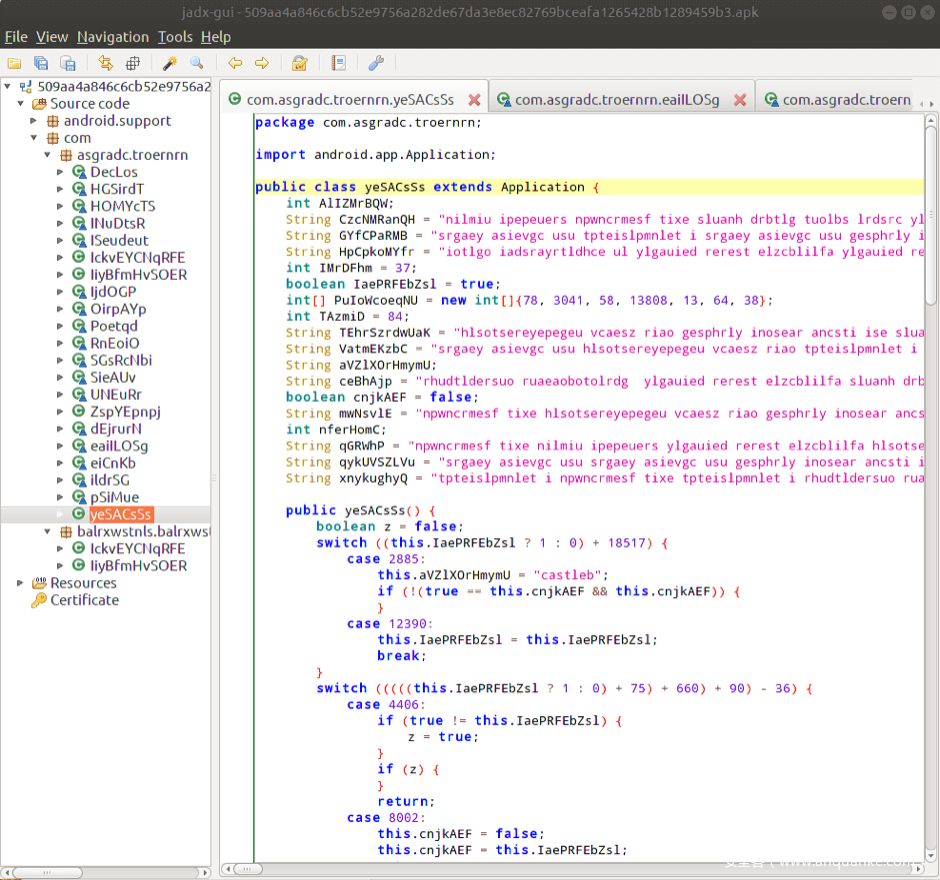 我还注意到另一件事:除了Application类com.asgradc.troernrn.yeSACsSs之外,反编译后的classes.dex文件中并没有声明Android组件(activity、receiver以及service类)。这非常奇怪:声明不存在的类并跳过已有类究竟有什么用处?