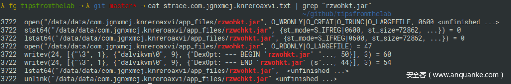 从日志中我们可以看到多次unlink()操作,这表明应用在执行过程中还会删除其他文件。第二次调用unlink()后,我们终于可以执行如下命令: