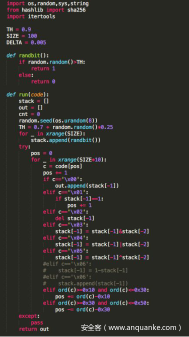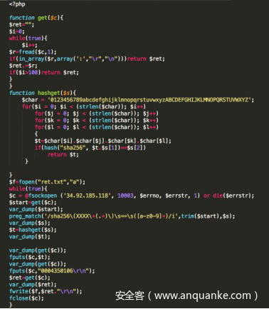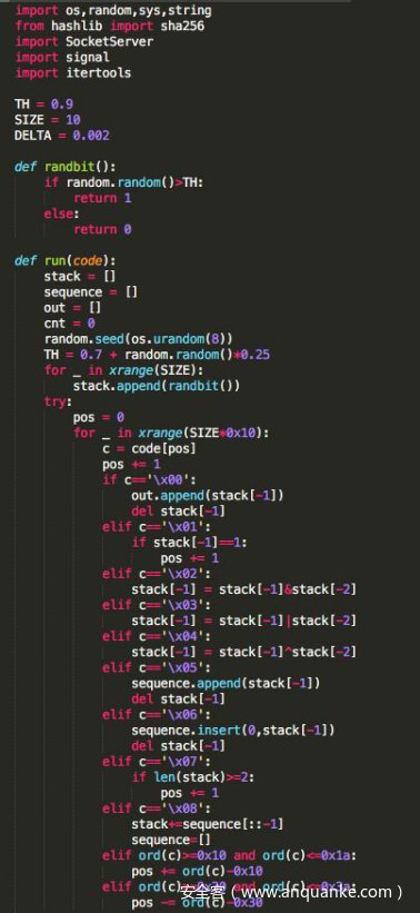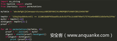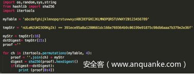 分析Python脚本源程序,发现其是两层加密,第一层是破解SHA256,求出输入字符的前4个字符,其破解SHA256的Python源代码如下。