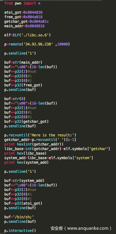4.从输出中得到libc基址,one_gadget get shell。