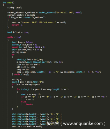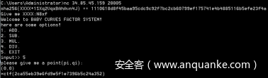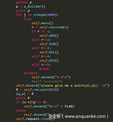 分析上述代码,进入这里的时候,前面很多应该是扰乱代码,输入”5”可进入下一步,输入一个坐标点(u,v),使其满足条件:(u*v)%p==0,这里的p是两个15比特素数的乘积,尝试多次输入两个素数,才使其满足前面的条件。后来总结时发现其实是可以输入(0,0)的,这可能是出题者的一个失误。
