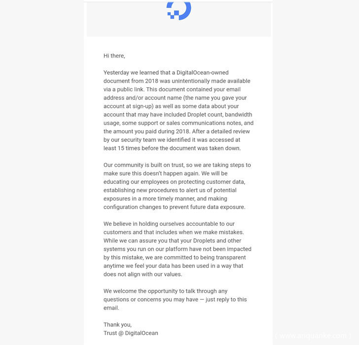 DigitalOcean在警告邮件中提到:“这份文件中包含您的电子邮件地址和/或账户名称(您在注册时使用的账户名)以及其他账户相关数据,其中可能包括Droplet数量、带宽使用情况、产品支持情况或者售卖通信记录,以及您在2018年的消费账单”。