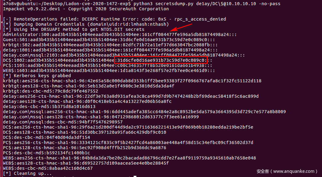 运行exp脚本,成功将AD域控的机器账户DC的密码置换成空: