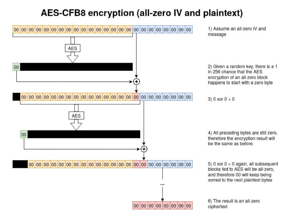 如此一来,通过AES-CFB8加密模式有1/256 概率用8字节全0 明文得到8字节全0密文。