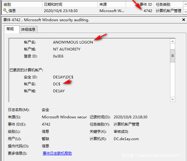 2、并且event ID 4742中帐户名为“ANONYMOUS LOGON”