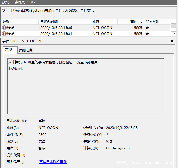 event ID 4742表示计算机帐户已更改,我们注意到帐户名是“ANONYMOUS LOGON”,受影响的帐户名称是域控制器计算机帐户(DC$)。所以event ID 4742可以用来发现疑似“Zerologon”漏洞攻击行为,但仅仅通过event ID 4742还不够,因为正常的账户更改也会产生event ID 4742,所以会产生一定的误报。由于攻击者需要通过netlogon RPC协议进行多次尝试,还会产生event ID 5805: