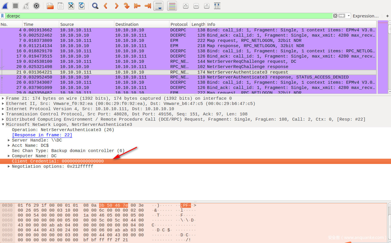 我们可以使用全流量工具过滤出netlogon协议信息(“protocols == dcerpc”),如果短时间内出现大量的NetrServerAuthenticate3请求,并且client credential全为0,这样的行为是比较异常的。可以参考SOC Prime Team利用zeek编写的Threat Hunting Rule: