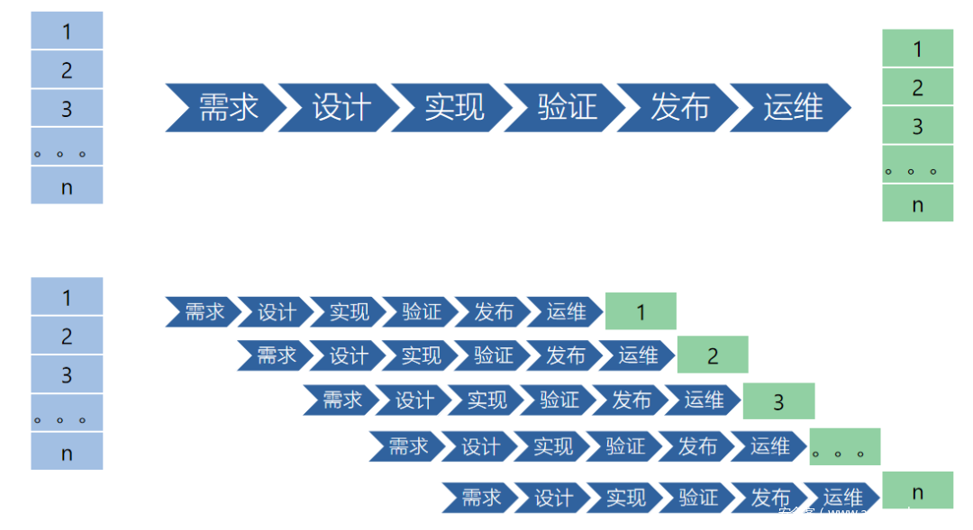 从实际情况来看,无论是瀑布模式还是敏捷模式,在需求价值这个颗粒度上的生命周期其实是一致的,只是瀑布模式是全量而敏捷模式是迭代增量。但是对于安全实践的落实却造成了影响,见下图。