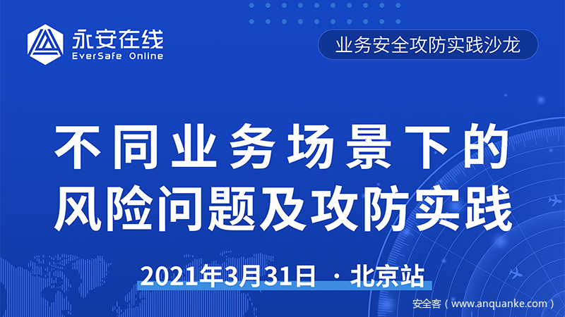 2021年3月31日【业务安全攻防实践系列沙龙】第一站—北京站正式开启,重磅推出【不同业务场景下的风险问题及攻防实践】沙龙。永安在线做东,诚邀各位安全同仁到场结实一帮志同道合的朋友,畅所欲言、群策群力!