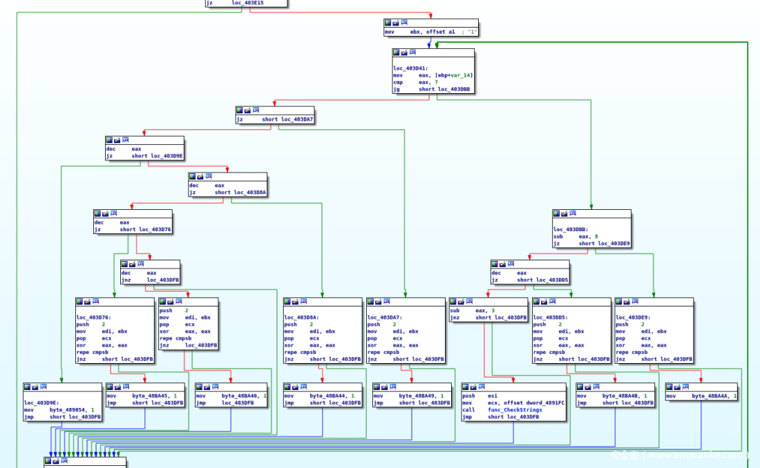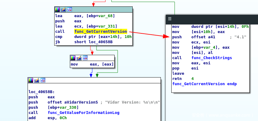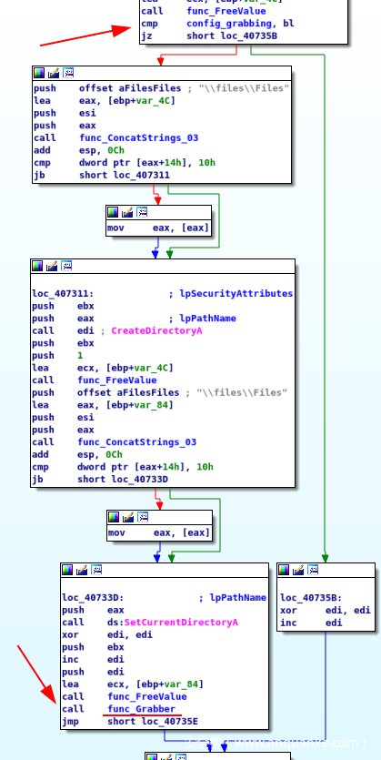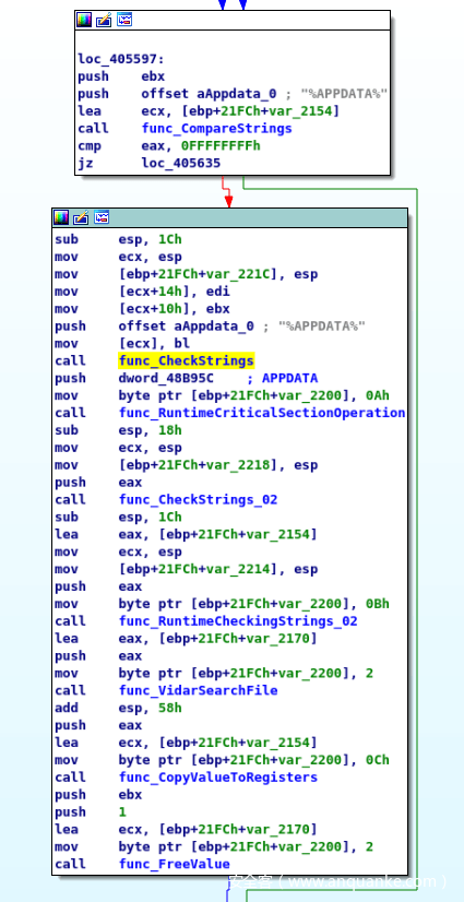 在下面的示例中,如果从C2下载的配置文件中存在“%APPDATA%”字符串。它将跳转进入该功能,并进行一系列验证,直到进入最重要的func_VidarSearchFile函数。