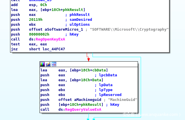通过RegOpenKeyExA,可以在注册表中获取该值:HKEY_LOCAL_MACHINESOFTWAREMicrosoftCryptographyMachineGuid