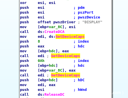 为了获得当前用户所使用屏幕的分辨率。将通过调用CreateDCA来为“Display”创建设备环境,并使用GetDeviceCaps来获取屏幕的长度和宽度。