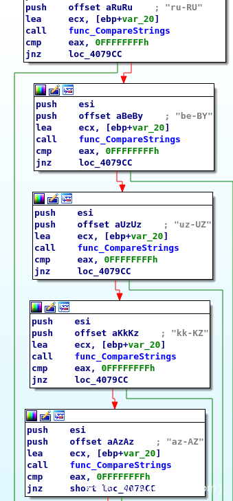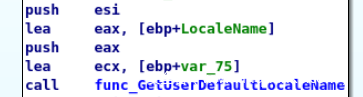 首先,如果受害者机器使用GetUserDefaultLocaleName来配置语言,我们可以使用很经典的方式(改变系统语言)来中止恶意软件。这也是检查恶意软件是否不会对一些特定的国家/地区进行感染最简单的办法之一。