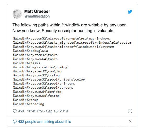 在 Windows 中,几乎所有的访问都由 安全描述符 控制。这篇文章的目的是:要建立一种方法来审计由 安全描述符错误配置引起的潜在风险。