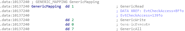 在看到此调用并参考相关文档之后,我可以看到此函数用于检查支持应用安全描述符的任何对象的访问。它还需要一个 GenericMapping参数。在这种情况下,wevtsvc.dll 为 AccessCheck 提供了一个由所需 GENERIC_MAPPING 结构组成的全局标量。在 IDA 中,它显示以下内容:
