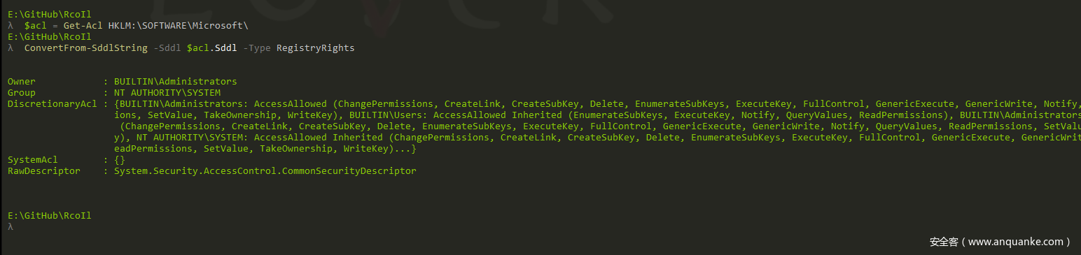 第一个命令使用Get-Acl来获取 HKLM:SOFTWAREMicrosoft 的安全描述符,并将其保存在变量中。