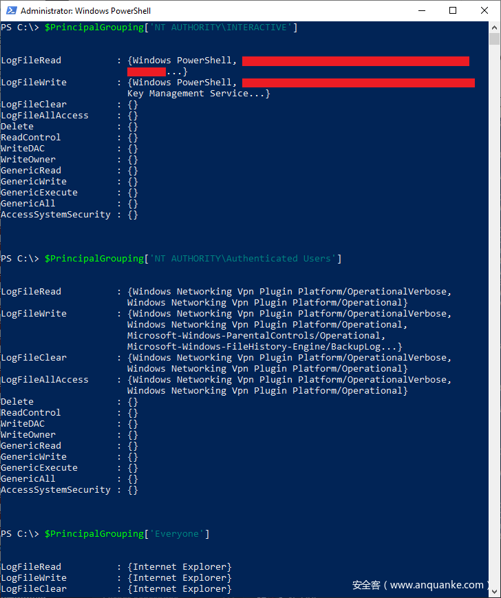 我更喜欢安全描述符审核的方式是:按允许访问的用户/组主体对访问进行分组。例如,我特别想知道 NT AUTHORITYAuthenticated Users组(非特权组)授予哪些事件日志访问权限。我编写了 powershell,以便查询内容: