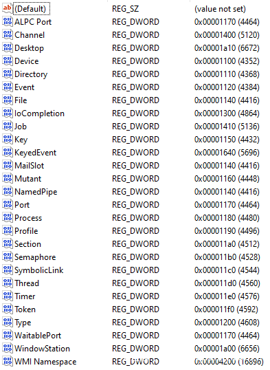 ActivationObject, ActivityReference, Adapter, ALPC Port, Callback, Composition, Controller, CoreMessaging, CoverageSampler, DebugObject, Desktop, Device, Directory, DmaAdapter, Driver, DxgkCompositionObject, DxgkCurrentDxgProcessObject, DxgkDisplayManagerObject, DxgkSharedBundleObject, DxgkSharedKeyedMutexObject, DxgkSharedProtectedSessionObject, DxgkSharedResource, DxgkSharedSwapChainObject, DxgkSharedSyncObject, EnergyTracker, EtwConsumer, EtwRegistration, EtwSessionDemuxEntry, Event, File, FilterCommunicationPort, FilterConnectionPort, IoCompletion, IoCompletionReserve, IRTimer, Job, Key, KeyedEvent, Mutant, NdisCmState, Partition, PcwObject, PowerRequest, Process, Profile, PsSiloContextNonPaged, PsSiloContextPaged, RawInputManager, RegistryTransaction, Section, Semaphore, Session, SymbolicLink, Thread, Timer, TmEn, TmRm, TmTm, TmTx, Token, TpWorkerFactory, Type, UserApcReserve, VRegConfigurationContext, WaitCompletionPacket, WindowStation, WmiGuid