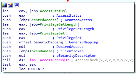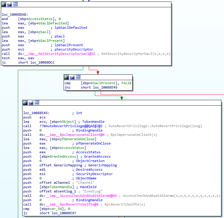 在搜寻 wevtsvc.dll 文件时,偶然发现了内部 EvtCheckAccess 函数中对 AccessCheck 函数的调用: