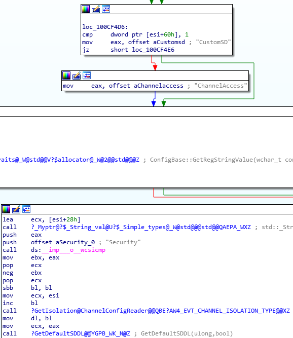 将带有符号的 wevtsvc.dll 载入 IDA 中,对 CustomSD 的交叉引用进行操作,进入 ChannelConfigReader::GetChannelAccessSddl 功能。