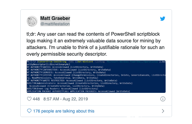 幸运的是,当在PowerShell 中调用 Get-WinEvent -ListLog 时,它将为每个事件日志返回一个EventLogConfiguration对象,其中包括 SecurityDescriptor 属性。
