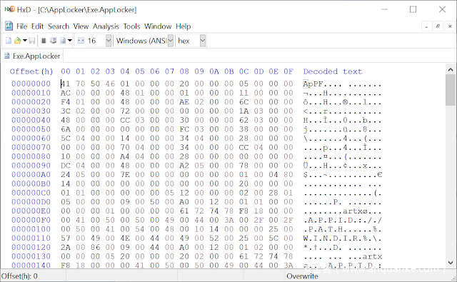 那么策略配置数据存放在哪里?注册表中含有部分数据,但核心策略配置数据存放于%WINDIR%\SYSTEM32\APPLOCKER目录中,按类型进行区分。比如可执行文件的配置位于EXE.APPLOCKER中,以此类推。当该目录中的文件被修改时,系统就会调用驱动来重载配置策略。如果我们使用十六进制编辑器查看这些文件,可以发现这些文件内容并不像我们输入的XML格式(如下图所示),后面的文章中我们会回到这方面内容。