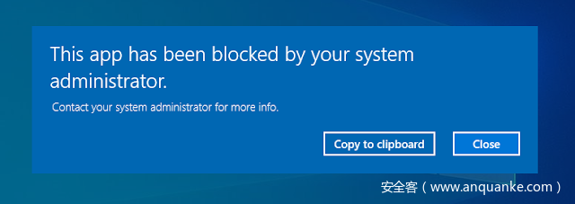 为了检查AL是否正常工作,我们可以创建一个新用户(使用New-LocalUser PowerShell命令),不将该用户加入本地管理员组。使用新用户登录,尝试将可执行文件拷贝到桌面目录并再次运行。这一次我们可以看到一个错误对话框,如下图所示:
