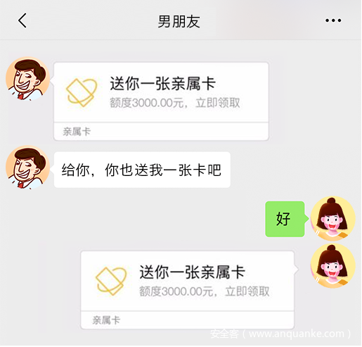 骗子伪装身份跟用户网恋,主动赠送“亲属卡”,并诱导用户回赠“亲属卡”。但其实骗子“亲属卡”绑定的银行账户并没有钱,用户根本无法刷卡消费,反而是骗子会盗刷用户赠送“亲属卡”的额度。