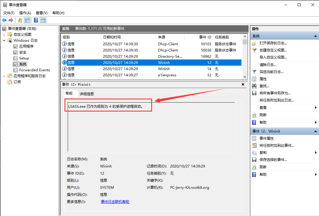 查看系统日志,事件id为12-LSASS.exe作为受保护的进程启动: