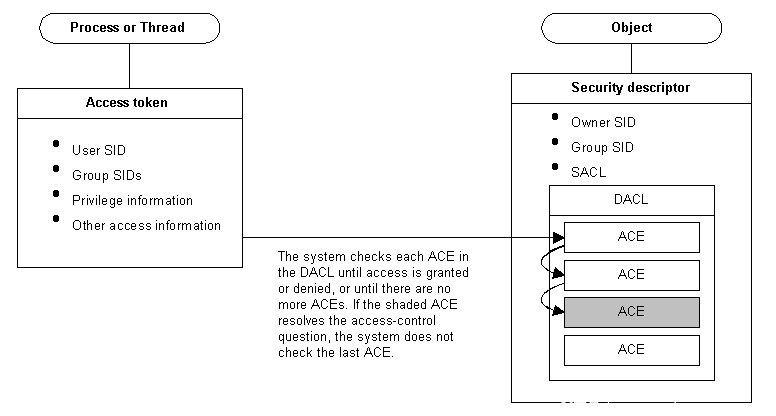 下图的图表示当某程序试图访问某个安全对象时,系统是如何检测的:系统会检测Object的DACL列表, 根据当前进程的Token,判断当前进程(线程)是否允许访问该Object。