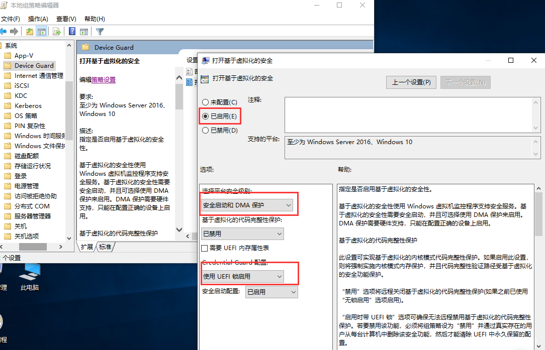 在组策略管理控制台中,在”计算机配置” -> “管理模板” -> “系统” -> “Device Guard”,打开”打开基于虚拟化的安全”,选择”已启用”;