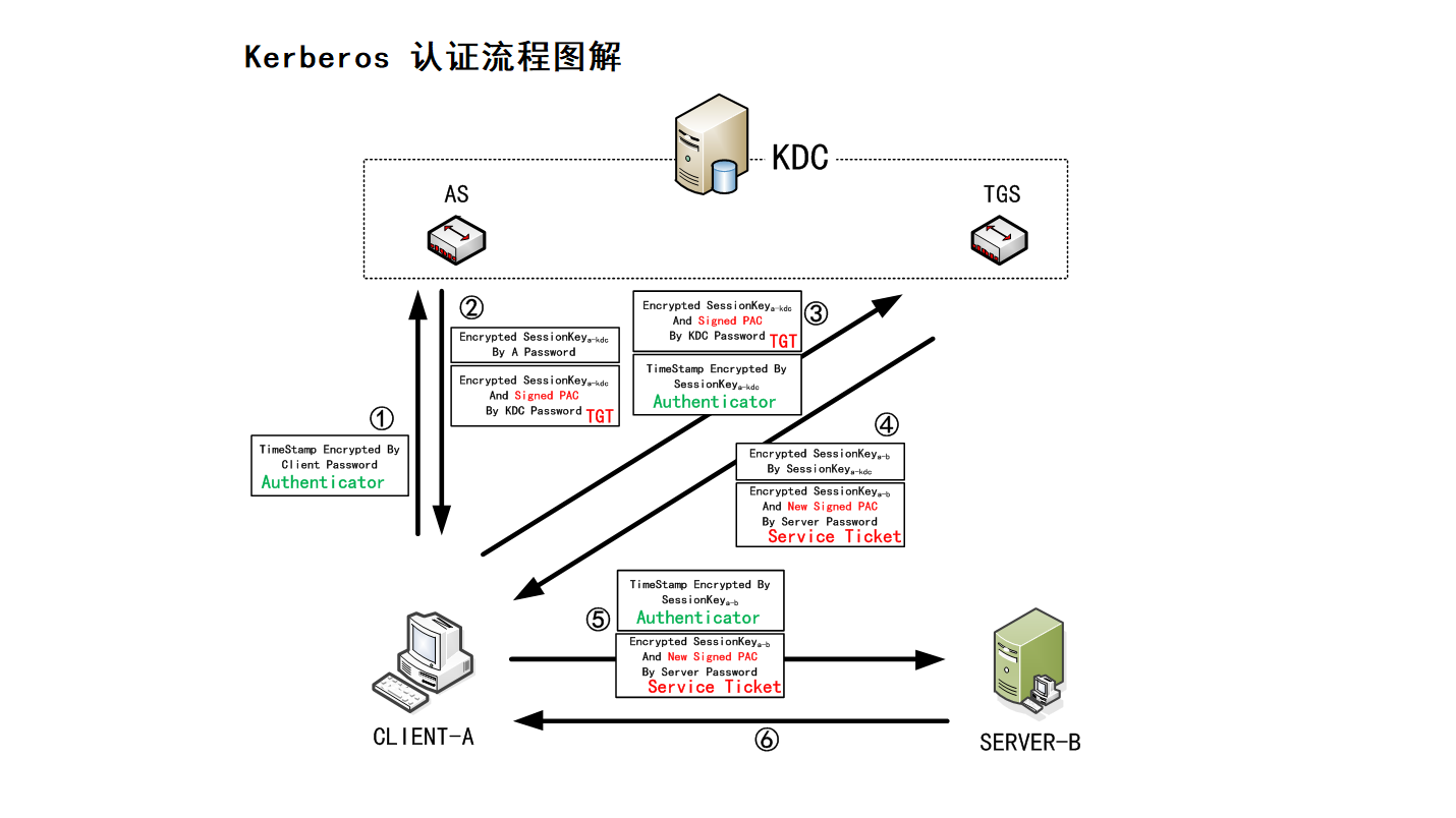 Client-A(客户端)、Server-B(服务端)、KDC(域控制器)