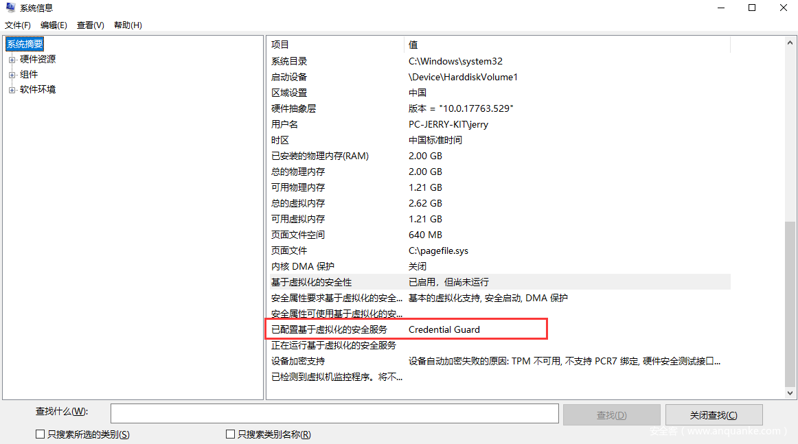 输入msinfo32.exe,在 ”系统摘要”-> ”已配置基于虚拟化的安全服务”处,可看到显示”Credential Guard”