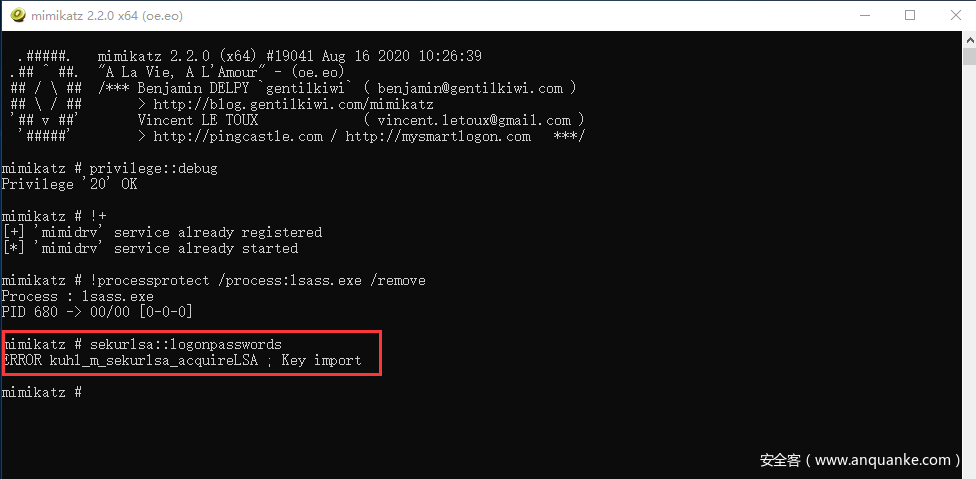 在开启LSA Protection保护时,mimikatz运行 sekurlsa::logonpasswords会报错 “ERROR kuhl_m_sekurlsa_acquireLSA;Handle on memery”