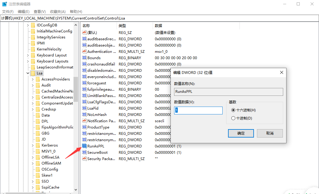 注册表位置开启LSA保护,然后重启系统生效。