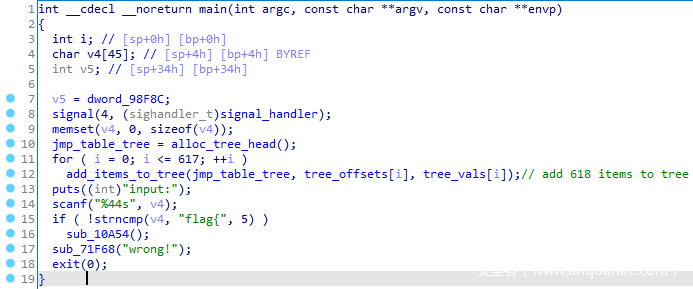 然后经过分析得知建立了一个二叉树头,并且把一个键值对表加入到了这个树里,最后要求输入44字符flag,起始固定为flag{,进入sub_10A54执行程序逻辑,由于需要repair,自然F5是没法儿好好解析了,其实还存在一段正确的输出。