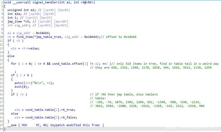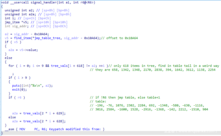 随后分析SIGILL处理函数,首先根据信号发生的位置sig_addr减去常量获得偏移,随后以这个为key去树里查找要跳转的位置,如果没有查找到,就去查找另一个表,如果找到了某一项,则根据找到的idx,去两个表里取得一个值,取哪个表取决于R6,这里应该是一个判断的结构