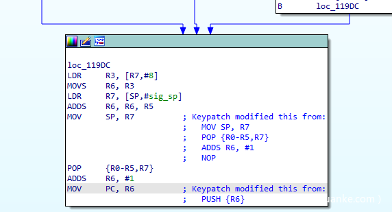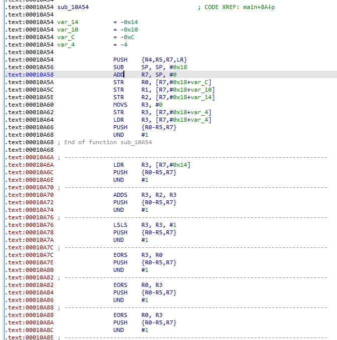 进入逻辑函数,发现充满了PUSH {R0-R5, R7}; UND #1;这样的东西,此时会进入到SIGILL的处理函数中进行跳转,因此本题的意义就是修复这段逻辑。